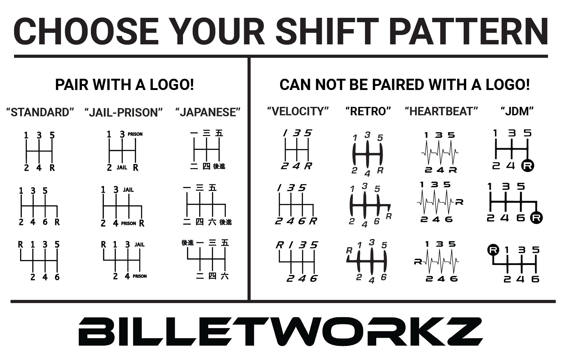 NOTE: Velocity, Retro, Heartbeat and JDM shift patterns cannot be paired with logos. If a logo is selected with these patterns, it will not be engraved.