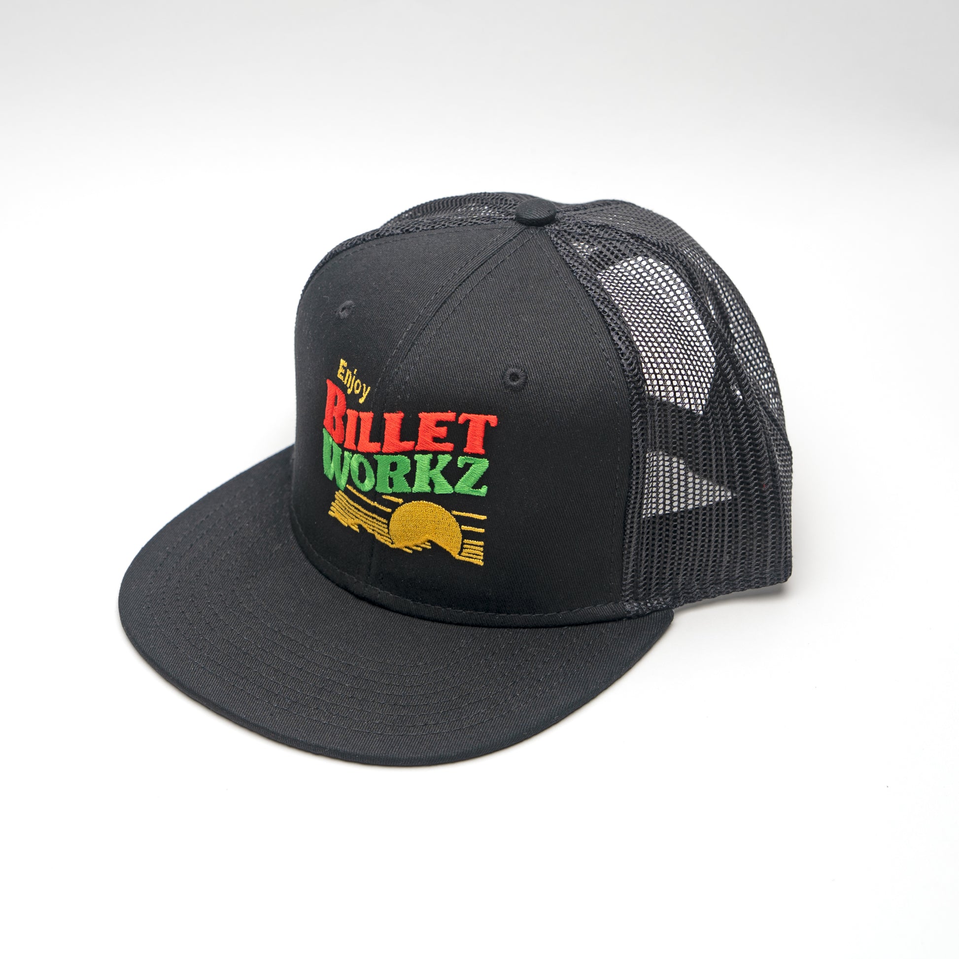 Bring chill vibes to every drive. This black mesh-back snapback features our “Enjoy Billetworkz” sunset graphic embroidered in bold red, green, and gold. A little retro, a little rowdy — perfect for anyone who likes their weekend cruise with a side of “shake ’n’ bake” energy. With a structured front, breathable mesh panels, and an adjustable snapback closure, it’s built for comfort whether you're wrenching, cruising, or hitting up the next meet.